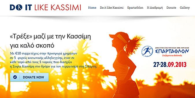 Η υπερ-μαραθωνοδρόμος αποδέχτηκε την πρόσκληση της WIND να τρέξει για 3η φορά έναν από τους δυσκολότερους αγώνες δρόμου στον κόσμο, προκειμένου να στείλει ένα δυνατό μήνυμα προσφοράς και κοινωνικής αλληλεγγύης. Έτσι, στις 27 Σεπτεμβρίου θα βρεθεί στην γραμμή εκκίνησης του Σπάρταθλον προκειμένου να συγκεντρώσει χρήματα για 5 κοινωνικούς φορείς. Η προσπάθεια της Σοφίας Κασσίμη καθώς και ο μηχανισμός μέσα από τον οποίο θα γίνονται οι δωρεές από κάθε ενδιαφερόμενο περιγράφεται στο www.doitlikekassimi.gr που δημιουργήθηκε για το σκοπό αυτό.