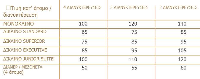 Τιμές Διαμονής Πασχαλινού Πακέτου Το πασχαλινό πακέτο ισχύει από 09 - 13/04/2015 µε ελάχιστη παραµονή τις 2 διανυκτερεύσεις. *Οι τιμές είναι κατά άτομο, ανά διανυκτέρευση και συμπεριλαμβάνουν όλους τους νόμιμους φόρους
