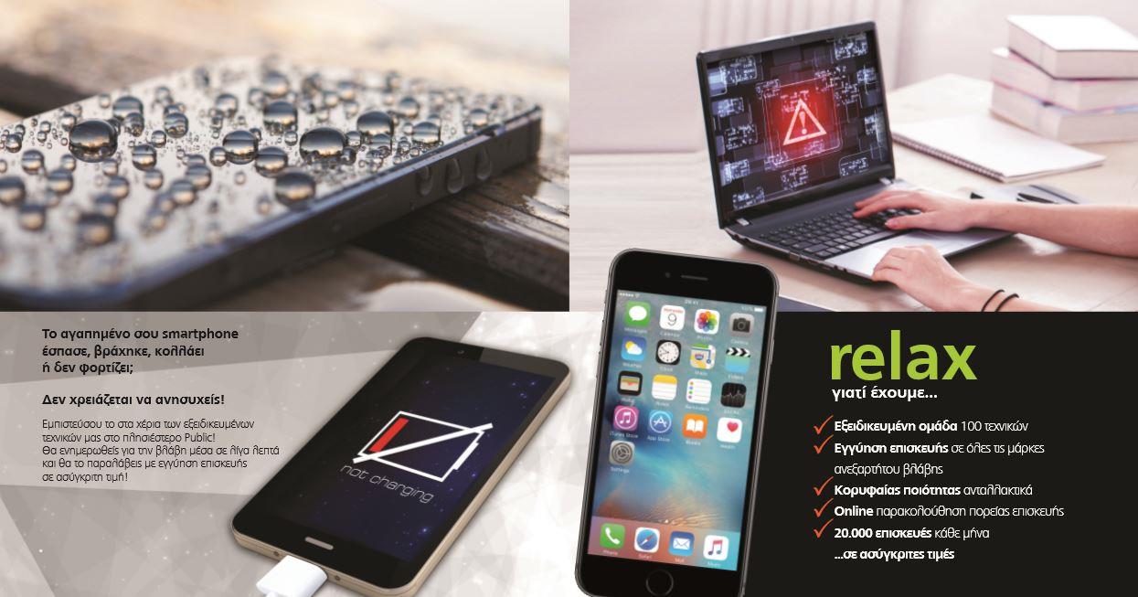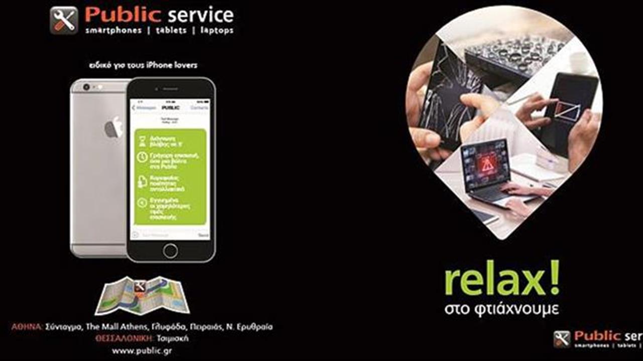Για όλες τις απρόβλεπτες καταστάσεις, για τις στιγμές που η συσκευή σας βρίσκεται στο πλυντήριο «ξεχασμένη» στο μπουφάν σας, για τις στιγμές που γίνεται το νέο «παιχνίδι» για το αγαπημένο σας κατοικίδιο ή για εκείνες τις στιγμές που απλά σας πέφτει από τα χέρια, μία επίσκεψη σε ένα κατάστημα Public μπορεί να τα κάνει όλα απλούστερα! Μέσα από μια μεγάλη γκάμα υπηρεσιών οποιοδήποτε πρόβλημα αντιμετωπίζετε στις συσκευές iPhone και iPad μπορεί να επιλυθεί εύκολα και πάντα με την εγγύηση Public! Γνωρίζοντας ότι οι κάτοχοι iPhone είναι 23% πιο επιρρεπείς σε ατυχήματα της συσκευής τους, τα καταστήματα Public προσφέρουν νέες προνομιακές τιμές για την επισκευή των αγαπημένων Apple προϊόντων. Για δυσκολίες στη σύνδεση του Wi-Fi και προβλήματα software, αλλά και για αντικατάσταση οθόνης και μπαταρίας της συσκευής, οι 150 εξειδικευμένοι τεχνικοί μπορούν να δώσουν τη λύση.