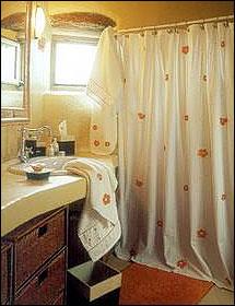 * Μετατρέψτε το μπάνιο σε φθινοπωρινό spa: Τα φθινοπωρινά χρώματα και αρώματα είναι ίσως τα πιο ζεστά και χαλαρωτικά από κάθε άλλη εποχή του χρόνου. Το μπάνιο μας, λοιπόν, μπορεί να μεταμορφωθεί σε ένα πραγματικό spa αν κάνουμε μερικές αλλαγές. Επιλέγουμε μία υφασμάτινη κουρτίνα μπάνιου με ζεστά χρώματα πράσινου ή κεραμιδί όπως αυτή της φωτογραφίας από τα