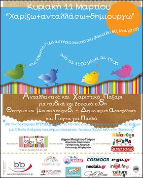 Την Κυριακή 11 Μαρτίου, στις 11.00 το πρωί, η ΜΚΟ Babyfeat μας υποδέχεται στο Κλειστό Γυμναστήριο Μοσχάτου για ένα χαριστικό-ανταλλακτικό παζάρι με πλούσιες δραστηριότητες για μικρούς και μεγάλους. Το In2life θα είναι εκεί.