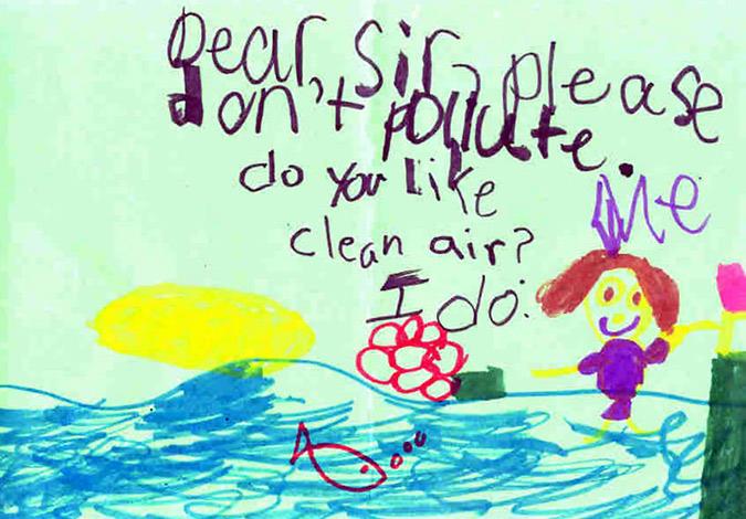 «Αγαπητέ κύριε, σας παρακαλώ μην μολύνετε την ατμόσφαιρα. Σας αρέσει ο καθαρός αέρας; Εμένα ναι». Ζωγραφιά οικολογικής ευαισθησίας από πιτσιρίκι του Ohio.