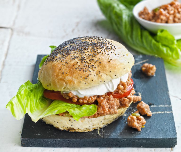 Ανοίγουμε στη μέση τα ψωμάκια και τα αφήνουμε άψητα γιατί ρουφούν καλύτερα τη σάλτσα. Αν θέλουμε, όμως, μπορούμε και να τα φρυγανίσουμε.Βάζουμε 1 γεμάτη κουτάλια σάλτσα κιμά, καλύπτουμε με φύλλο μαρουλιού, συνεχίζουμε με φέτα ντομάτα και ξαναβάζουμε κιμά. Τελειώνουμε με μια κουτάλια στραγγιστό γιαούρτι. Σκεπάζουμε με το υπόλοιπο ψωμί και πατάμε ελαφρά να ποτίσει το ψωμί με τα ζουμάκια της σάλτσας.