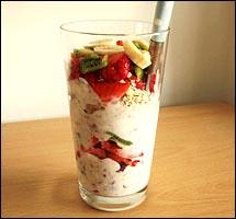 Γιαούρτι parfait με φρέσκα φρούτα  Τηγανίτα με μαρμελάδα και φρέσκα φρούτα