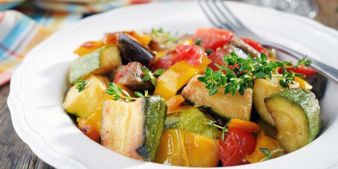 Υλικά: 4-5 μελιτζάνες μέτριες, 3 κολοκύθια μεγαλούτσικα, 2-3 πατάτες μέτριες, 5-6 πιπεριές (οποιουδήποτε είδους ή ανάμεικτες), 2 μεγάλα ή 3 μέτρια ξερά κρεμμύδια, τριμμένη ντομάτα περίπου 400ml και ακόμη 1-2 ντομάτες ολόκληρες, 5-6 σκελίδες σκόρδο, 1 κούπα ψιλοκομμένο μαϊντανό, αλάτι, πιπέρι, περίπου 1 κούπα ελαιόλαδο, ½ κούπα κρασί (προαιρετικά) Εκτέλεση: Καθαρίζουμε και πλένουμε τις μελιτζάνες και τα κολοκύθια και τα κόβουμε σε κομμάτια (ροδέλες με πάχος 2 δάκτυλα περίπου). Καθαρίζουμε και κόβουμε και τις πιπεριές. Αν είναι πιπεριές-κέρατα, αρκεί να τις κόψουμε σε δυο μακρόστενα κομμάτια. Τα αλατίζουμε ελαφρά. Καθαρίζουμε και τις πατάτες και τα κρεμμύδια. Ανάβουμε το φούρνο τους 200 βαθμούς να θερμαίνεται ώσπου να ετοιμάσουμε το ταψί μας. Σε ένα μπολ κόβουμε το κρεμμύδι σε καρεδάκια, προσθέτουμε την τριμμένη ντομάτα, τον μαϊντανό, το σκόρδο, λίγο αλάτι ακόμη, το πιπέρι και το μισό ελαιόλαδο (και το κρασί, προαιρετικά). Τα ανακατεύουμε – ή, ακόμη καλύτερα, τα ζυμώνουμε λίγο με το χέρι μας να ανακατευτούν οι μυρωδιές. Απλώνουμε τα λαχανικά σε ταψί (να είναι λίγο απλωτά και όχι στοιβαγμένα) και από πάνω βάζουμε τις πατάτες σε φέτες και τις ολόκληρες ντομάτες κομμένες σε όγδοα. Περιχύνουμε με τη σάλτσα και με το υπόλοιπο ελαιόλαδο. Ανακατεύουμε. Σκεπάζουμε το ταψί με αλουμινόχαρτο και το βάζουμε στο φούρνο (η σχάρα στην πρώτη θέση από το κάτω μέρος). Σε μία ώρα αφαιρούμε το αλουμινόχαρτο, ελέγχουμε αν θέλει λίγο νεράκι και συνεχίζουμε το ψήσιμο για 50-60 λεπτά ακόμη, μέχρι να μαλακώσουν τα λαχανικά και να μελώσει η σάλτσα. Σερβίρουμε ζεστό, χλιαρό ή σε θερμοκρασία δωματίου και συνοδεύουμε με φέτα ή με γιαούρτι. Η συνταγή είναι από εδώ