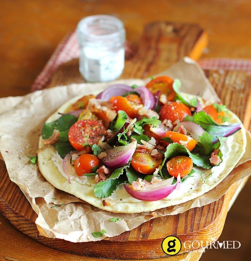 Υλικά: 4 μεγάλες αραβικές πίτες, 30 ντοματίνια, 1 κρεμμύδι ψιλοκομμένο, 1/2 ματσάκι μαϊντανό, 1 αγγουράκι, 8 φέτες μπέικον, 1 ματσάκι ρόκα, 200 γρ. γιαούρτι, 100 γρ. φέτα τρίμα, ρίγανη – θυμάρι
