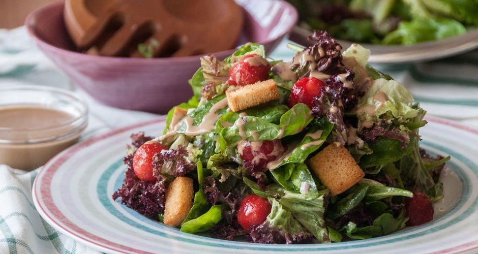 Για τα κρουτόν: Ψήνουμε τις φέτες ψωμί σε προθερμασμένο φούρνο στους 160 βαθμούς για 10-12 λεπτά σε ένα ταψάκι με λαδόκολλα. Τις πασπαλίζουμε με 1 κ.σ. λάδι και τις αλατοπιπερώνουμε. Πασπαλίζουμε τη σαλάτα με τα κρουτόν και σερβίρουμε.