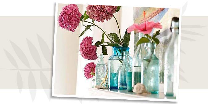 Αξιοποιήστε τα γυάλινα μπουκάλια που δεν χρησιμοποιείτε. Διαλέξτε όσα από αυτά έχουν παρόμοιες αποχρώσεις ώστε να δίνουν ομοιόμορφη εικόνα και να δένουν αρμονικά με τον χώρο – σε αυτό θα βοηθήσουν και τα κατάλληλα λουλούδια, αν επιλέξετε να τα χρησιμοποιήσετε σαν βάζα.