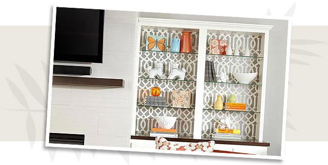 Χρησιμοποιήστε χαρτί ή ταπετσαρία για να ντύσετε το πίσω μέρος μιας βαρετής βιβλιοθήκης η ραφιέρας, η οποία έτσι θα αποκτήσει στιλ και θα αναδείξει τα αντικείμενα που θα τοποθετηθούν μπροστά της.