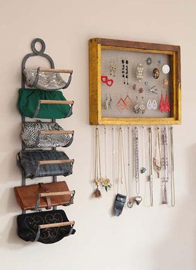 Χρησιμοποιήστε μια οινοθήκη ως βάση για τις τσάντες και τα πορτοφόλια σας – extra tip: με μικρούς γάντζους κάτω από ένα κάδρο, έχετε και ωραιότατη θήκη για τα κολιέ και τα κρεμαστά σας αξεσουάρ: