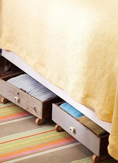 Βάλτε ροδάκια στα συρτάρια του παλιού σας γραφείου και μετατρέψτε τα σε εξτρά αποθηκευτικό χώρο για ρούχα, κουβέρτες και σεντόνια κάτω από το κρεβάτι σας:
