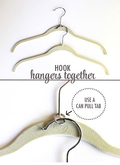 Χρησιμοποιήστε «κλειδάκια» από κουτιά αναψυκτικών για να προσαρμόσετε κρεμάστρες σε… άλλες κρεμάστρες και να δημιουργήσετε έτσι ένα δεύτερο, πιο χαμηλό επίπεδο ρούχων στην ντουλάπα, διπλασιάζοντας στην ουσία τον αποθηκευτικό της χώρο: