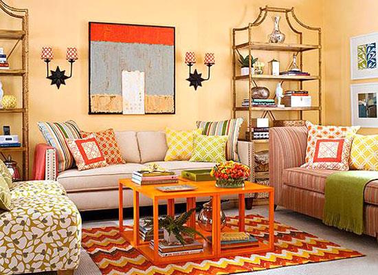 Βάλτε χρώμα: Δεν χρειάζεται να βάψετε από την αρχή τους τοίχους, ή να ξοδέψετε μια μικρή περιουσία σε καινούρια funky έπιπλα. Με μια προσεκτική ματιά στην παραπάνω φωτογραφία, θα παρατηρήσετε ότι το έντονο χρώμα που ακτινοβολεί προέρχεται από τις λεπτομέρειές της: τα μαξιλαράκια του καναπέ, τα ριχτάρια, το μικρό χαλί στο κέντρο και το απλό ξύλινο τραπεζάκι που μπορείτε να βάψετε μόνοι σας.