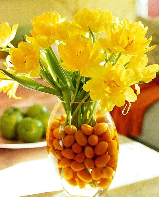 Λαϊκή αγορά: Ό,τι λέγαμε προηγουμένως για τα λουλούδια, ισχύει εξίσου και για τα χρωματιστά φρούτα της εποχής. Στο βάζο της φωτογραφίας αυτά που βλέπετε δεν είναι βότσαλα, αλλά κουμ κουάτ, που κάνουν ωραίο χρωματικό συνδυασμό με τα λουλούδια. Αντί να κρύβετε τα φρούτα στο ψυγείο (που ούτως ή άλλως αλλοιώνει την γεύση τους) στολίστε τα σε παλιούς «γιαγιαδίστικους» δίσκους δημιουργώντας ενδιαφέροντες χρωματικούς συνδυασμούς.