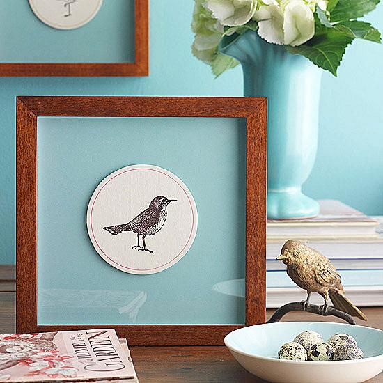 Ανοιξιάτικα καδράκια: Οι κορνίζες που αναφέραμε παραπάνω μπορούν να «γεμίσουν» όχι μόνο με φλοράλ μοτίβα αλλά και με εικόνες της εξοχής, όπως ο συμπαθέστατος σπίνος της φωτογραφίας. Πού θα τις βρείτε; Φαντασία να υπάρχει: Σε παλιά περιοδικά, στα παιδικά σας βιβλία, στο internet για να τις εκτυπώσετε, ακόμα και σε… σουβέρ σαν αυτό της φωτογραφίας.