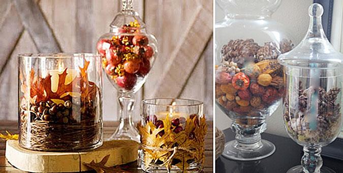 Αξιοποιώντας μεγάλες γυάλες ή βάζα και γεμίζοντάς τες/τα με το φθινοπωρινό σας ντεκόρ (αποξηραμμένα φύλλα δέντρων, βελανίδια, φρούτα σε τόνους του μπορντό και του καφέ, κουκουνάρια κ.α.) στολίζετε όμορφα και φθινοπωρινά τραπεζαρίες και κομοδίνα.