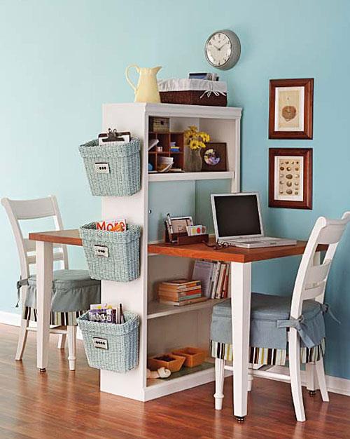 Δεν έχετε καν αρκετό χώρο για γραφείο; Δείτε στην φωτογραφία πώς μπορεί ένα τραπέζι κουζίνας να ενωθεί με μια ραφιέρα και να μεταμορφωθεί όχι σε ένα, αλλά σε δύο γραφεία με άνεση και ιδιωτικότητα.