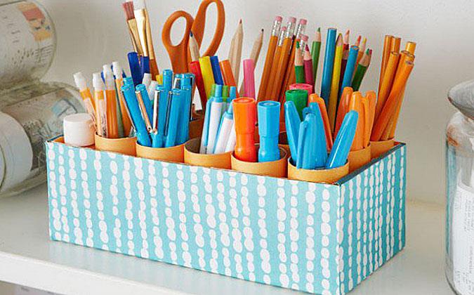 Κρατήστε τα χαρτονένια ρολά από το χαρτί υγείας, και όταν μαζευτούν αρκετά, φτιάξτε κυλινδρικές θήκες μέσα σε κουτί παπουτσιών, όπως στη φωτογραφία, για να γλιτώσετε τα σκορπισμένα αντικείμενα στην επιφάνεια του γραφείου.