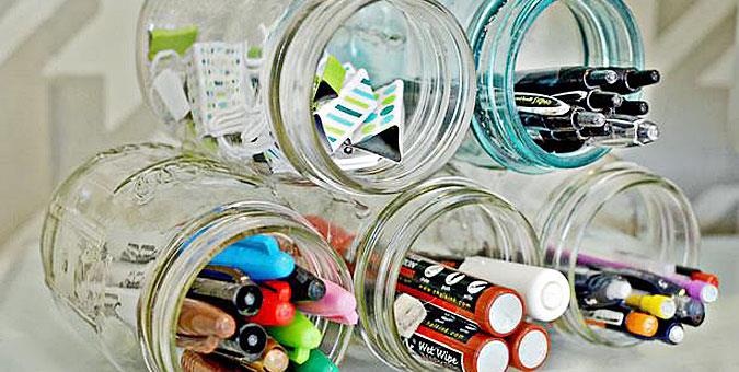 Χρησιμοποιήστε γυάλινα βαζάκια ως ωραιότατες θήκες για στυλό, μολύβια και μαρκαδοράκια, που θα δώσουν και μια βιομηχανική νότα στο γραφείο σας. Μπορείτε να τα κρατήσετε σταθερά, όπως στην φωτογραφία, ενώνοντάς τα με λίγη κόλλα.