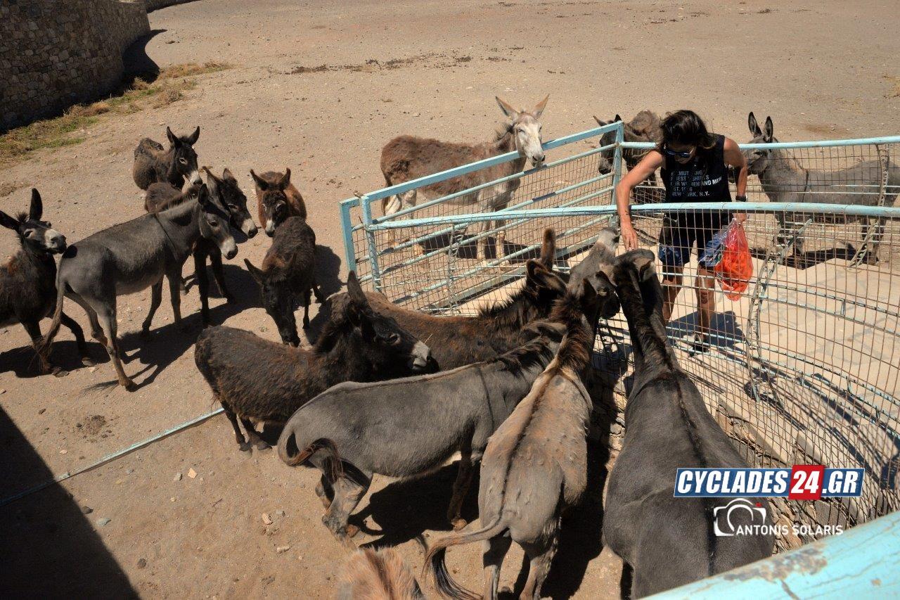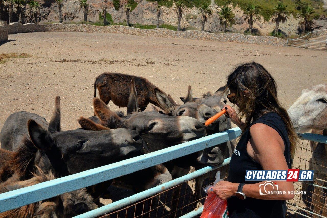 Όπως διαβάζουμε στο ρεπορτάζ του Cyclades24, σε έναν πανέμορφο χώρο με θέα στην θάλασσα η ιδιοκτήτρια επιχειρήσεων στο νησί φέρνει καθημερινά καρότα στους τετράποδους κατοίκους της ιδιότυπης φάρμας της, τους χαϊδεύει, τους φροντίζει και τους μιλά με τα ονόματά τους.