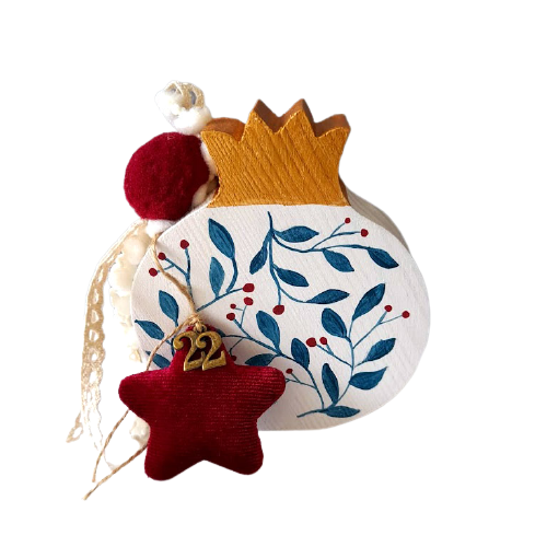 Ένα γλυκύτατο, όσο και πρωτότυπο χειροποίητο γούρι, ζωγραφισμένο στο χέρι με ακρυλικά χρώματα και στολισμένο με κόκκινο πομ πον, βελούδινο αστεράκι και μεταλλικά στοιχεία. Το ρόδι είναι, ως γνωστόν, σύμβολο αφθονίας, γονιμότητας και καλής τύχης. Το αγοράζεις online από εδώ, με 15€.