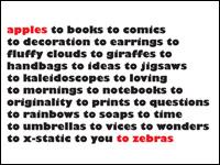 «Στο e-shop μας θα βρείτε βιβλία, ημερολόγια, διακοσμητικά αντικείμενα και διάφορα αξεσουάρ», μας λέει η κ. Κανακάκη. Έτσι άλλωστε εξηγείται και το όνομα του project. «Apples to Zebras, Α-Ζ, σαν να λέμε από το άλφα ως το ωμέγα, πάντα με ιδιαίτερο στιλ», μας εξηγεί η υπεύθυνη του site με το ευφάνταστο όνομα. Και πράγματι, στις κατηγορίες του χωρούν τα πάντα: Εντοπίσαμε εκτός των άλλων ενδιαφέροντα υπογεγραμμένα prints, κοσμήματα, χρηστικά αντικείμενα για το σπίτι, comic books και πολλές ακόμη μικρές design εκπλήξεις.