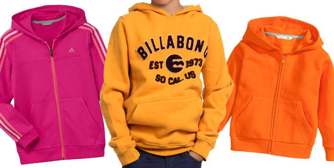 Από αριστερά προς τα δεξιά: Φούτερ για κορίτσια ροζ με φερμουάρ Adidas (39€ από εδώ), Φούτερ billabong για αγόρια σε κίτρινο χρώμα (35€ από εδώ), πορτοκαλί τζάκετ με κουκούλα για αγοράκια από τα H&M (10€ από εδώ).