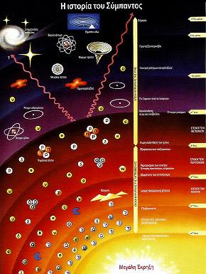 • Όλα ξεκίνησαν από μια Μεγάλη Έκρηξη. Στην αρχή υπήρχε μια πυκνή «σούπα» στοιχειωδών σωματιδίων. Η θερμοκρασία ήταν τεράστια. • Το διαστελλόμενο σύμπαν κρυώνει. Εμφανίζονται τα σωμάτια που δημιουργούν τα πρωτόνια και νετρόνια (κουάρκς). • Ενώ η θερμοκρασία συνεχίζει να πέφτει εμφανίζονται τα ηλεκτρόνια και τα άλλα λεπτόνια. • Δημιουργούνται οι πυρήνες υδρογόνου και ηλίου (από σύντηξη) και εμφανίζονται τα φωτόνια. • Δημιουργούνται τα πρώτα άτομα και το σύμπαν γίνεται διαπερατό από το φως. • Δημιουργούνται τα πρώτα άστρα και οι γαλαξίες. Στους πυρήνες των μεγάλων άστρων δημιουργούνται, πάντα με σύντηξη, τα βαρύτερα στοιχεία. • Το σύμπαν συνεχίζει να διαστέλλεται αλλά όπως έδειξαν πρόσφατες μετρήσεις, με επιταχυνόμενο ρυθμό!