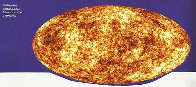 Όσο η θερμοκρασία έπεφτε, τόσο ευκολότερο ήταν για τους πυρήνες να τραβήξουν τα ελεύθερα ηλεκτρόνια και να δημιουργήσουν τα πρώτα άτομα. Τώρα το σύμπαν γίνεται διαφανές (εφόσον τα σωμάτια σχημάτισαν άτομα) και το φως μπορεί πλέον να το διαπερνά. Η ακτινοβολία αυτή, που υπολογίζεται να μπόρεσε να εκπεμφθεί 300.000 χρόνια μετά τη δημιουργία και που ανήκει στα μικροκύματα ανιχνεύθηκε τυχαία από τους Άρνο Πενζίας και Ρόμπερτ Ουίλσον το 1964. Οι παρατηρήσεις τους ταίριαζαν με τις προβλέψεις των Γκάμοφ, Άλφερ και Χέρμαν (1948) σύμφωνα με τις οποίες η σημερινή θερμοκρασία του διαστελλόμενου σύμπαντος πρέπει να είναι -268 βαθμοί Κελσίου (5Κ), αν και όταν όλα ξεκίνησαν ήταν δισεκατομύρια των δισεκατομυρίων βαθμοί. Η εικόνα αρχίζει και γίνεται πιο καθαρή (Σχ.1): Σχήμα 1 (από το βιβλίο: «Η βιογραφία του Σύμπαντος, Δ.Π.Σιμόπουλος, ΕΡΕΥΝΗΤΕΣ 2008.)