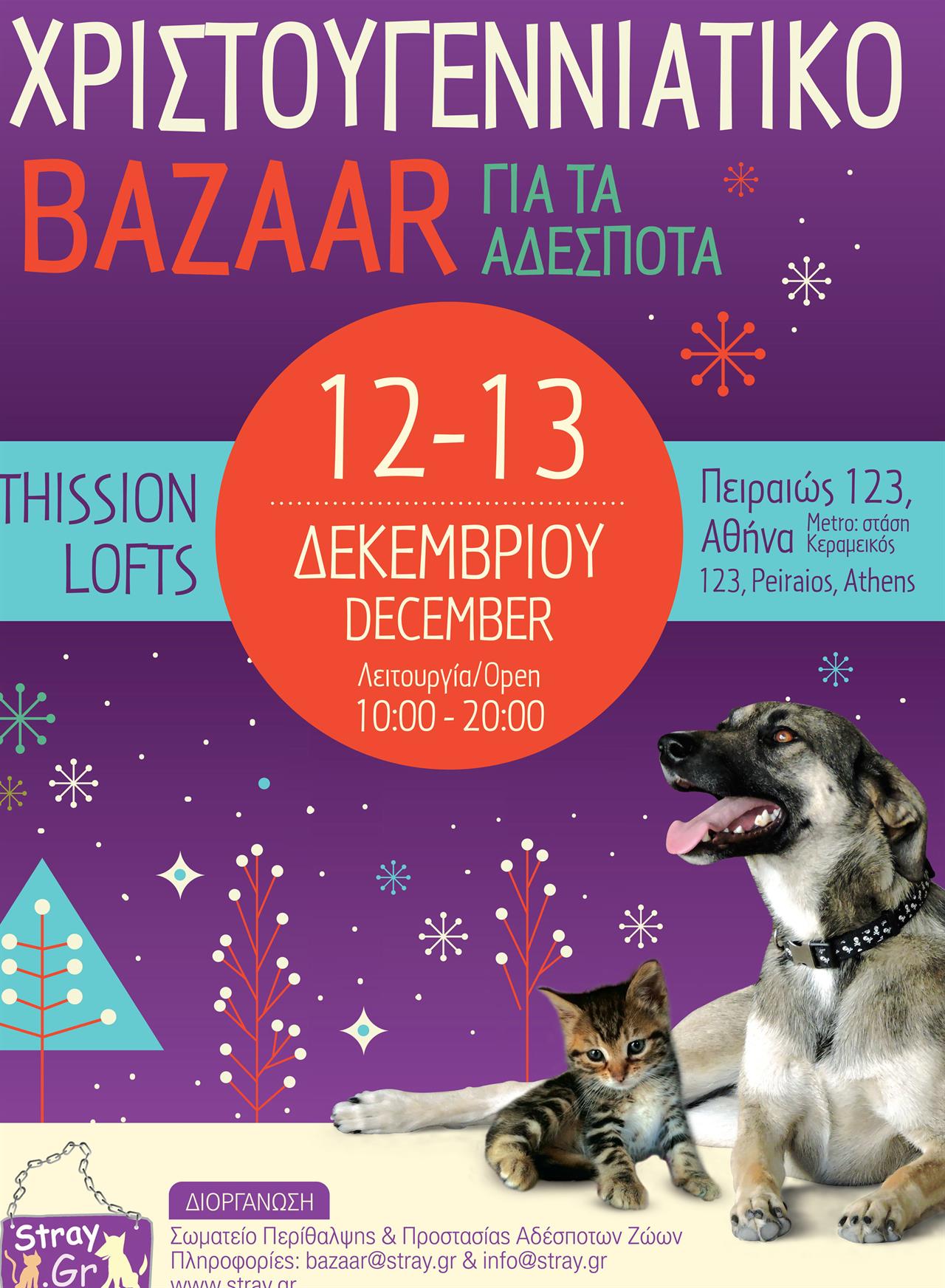 Oι εθελοντές του Σωματείου Περίθαλψης και Προστασίας Αδέσποτων Ζώων «Stray.Gr» μας προσκαλούν στο 12ο Χριστουγεννιάτικο Bazaar για τα αδέσποτα ζώα που θα πραγματοποιηθεί το Σάββατο 12 και την Κυριακή 13 Δεκεμβρίου 2015, 10:00-20:00, στο Thission Lofts, Πειραιώς 123, Αθήνα, απέναντι από την Τεχνόπολη στο Γκάζι (στάση Μετρό Κεραμεικός). Στο bazaar θα βρούμε ρούχα, κοσμήματα, αξεσουάρ, διακοσμητικά είδη, χρηστικά αντικείμενα, χριστουγεννιάτικα γούρια και στολίδια για το σπίτι, αξεσουάρ, παιχνίδια, τροφές και πολλά άλλα είδη για τους τετράποδους φίλους μας.  Επίσης, χειροποίητα γλυκά και τρόφιμα, χειροποίητα σαπούνια και διακοσμητικά κεριά, μεταχειρισμένα ρούχα, παπούτσια, αξεσουάρ και είδη σπιτιού, βιβλία καινούρια και μεταχειρισμένα, και φυσικά όλα τα αναμνηστικά είδη του σωματείου stray.gr: T-shirts για μικρούς και μεγάλους, φούτερ, τσάντες, ποδιές μαγειρικής, κούπες μπρελόκ, κοσμήματα κ.ά.