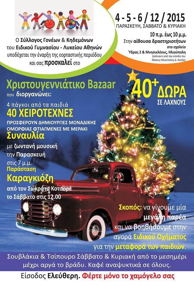 Με σκοπό την ενίσχυση για την αγορά σχολικού λεωφορείο με ράμπα για ΑΜΕΑ, ο Σύλλογος Γονέων και Κηδεμόνων του Ειδικού Γυμνασίου - Λυκείου Αθηνών υποδέχεται την έναρξη της εορταστικής περιόδου με ένα πλούσιο bazaar. Στο σχολείο της Ηλιούπολης θα βρείτε κοσμήματα σε κάθε μορφή, μπλούζες ζωγραφιστές στο χέρι, σκουφάκια, κεριά, κρέμες και κηραλοιφές, χειροποίητα σαπούνια, τσάντες, πορτοφόλια, αρώματα και περισσότερα από 40 δώρα σε λαχνούς. Το bazaar θα πραγματοποιηθεί από τις 4 μέχρι τις 6 Δεκεμβρίου από τις 10.00 μέχρι τις 22.00.