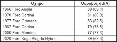Μία δοκιμή που πραγματοποίησε η Ford έδειξε ότι οι επιβάτες του νέου Ford Kuga Plug-In Hybrid βιώνουν επίπεδα εσωτερικού θορύβου που αντιστοιχούν στο 25% εκείνων που βίωναν οι παππούδες τους σε ένα Ford Anglia του 1966. Οι περισσότεροι άνθρωποι αντιλαμβάνονται ότι ένας ήχος είναι διπλάσιος από κάποιον άλλο όταν είναι περίπου 10 decibel υψηλότερος.