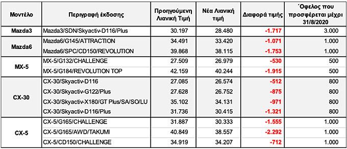 Στα περισσότερα μοντέλα Mazda σημειώνονται σημαντικές διαφορές τιμών έως και -1,700€. Ειδικότερα στα μοντέλα Mazda3 & CX-30 εντοπίζονται σημαντικές μειώσεις τιμών στις εκδόσεις Skyactiv- D (Diesel).