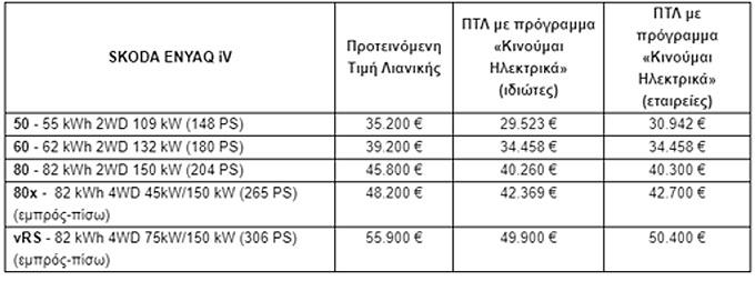 Η Kosmocar-Skoda, ανακοινώνει τις ενδεικτικές προτεινόμενες τιμές λιανικής του μοντέλου, στις οποίες σίγουρα ξεχωρίζει αυτή της εισαγωγικής έκδοσης. Εξοπλισμένο με κινητήρα 109 kW, πίσω κίνηση και αυτονομία έως 340 χλμ., έχει προτεινόμενη τιμή λιανικής 35.200 ευρώ, που μετά την επιδότηση του προγράμματος «Κινούμαι Ηλεκτρικά» διαμορφώνεται ουσιαστικά σε 29.523 ευρώ.