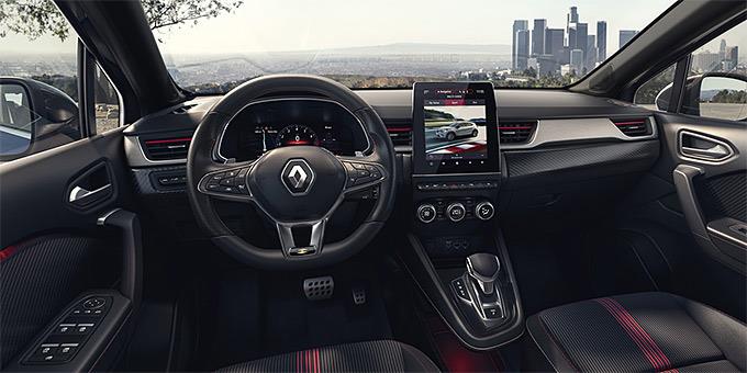 Αυτή η υπογραφή βρίσκεται και μέσα στη συγκεκριμένη κόκκινη ταπετσαρία και στο διάτρητο δερμάτινο τιμόνι με κόκκινη και γκρι ραφή. Τα μαρσπιέ από αλουμίνιο δείχνουν την κληρονομιά της Renault Sport. Το εσωτερικό είναι διακοσμημένο με μια κόκκινη γραμμή στους αεραγωγούς και το ταμπλό, με φινίρισμα από άνθρακα. Το ψηφιακό ταμπλό 10 ιντσών, η εμπρός και πίσω υποβοήθηση στο πάρκινγκ με κάμερα πίσω όψης, ο επαγωγικός φορτιστής και ο ηλεκτροχρωματικός εσωτερικός καθρέφτης είναι στο βασικό, στάνταρ εξοπλισμό.