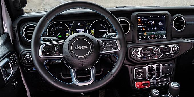 Καρδιά του υβριδικού συστήματος είναι ένας προηγμένος Turbo βενζινοκινητήρας 2 λίτρων που συνδυάζεται με το σύγχρονο αυτόματο κιβώτιο των 8 σχέσεων. Μαζί του συνεργάζονται δύο ηλεκτροκινητήρες, προσφέροντας κίνηση 4x4 ακόμα και αμιγώς ηλεκτρικά, για απόλυτα αθόρυβες εκτός δρόμου διαδρομές. Με όλες τις εκδόσεις να διαθέτουν την πιστοποίηση Trail Rated, διαθέσιμα είναι δύο κατ’ επιλογή συστήματα τετρακίνησης (το Selec-Trac ή το Rock-Trac στην έκδοση Rubicon), νέας γενιάς άξονες Dana, σύστημα εμπλοκής των εμπρός και πίσω τροχών Tru-Lok, πίσω διαφορικό περιορισμένης ολίσθησης Trac-Lok, αλλά και η δυνατότητα ηλεκτρονικής αποσύνδεσης της εμπρόσθιας αντιστρεπτικής ράβδου, για την απόλυτη ελευθερία άρθρωσης. Όλα τα παραπάνω συνδυάζονται με μέση κατανάλωση (στο υβριδικό πρόγραμμα λειτουργίας) της τάξης των 3,5 λίτρων/100χλμ. και μειωμένες εκπομπές CO2 κατά 70%.
