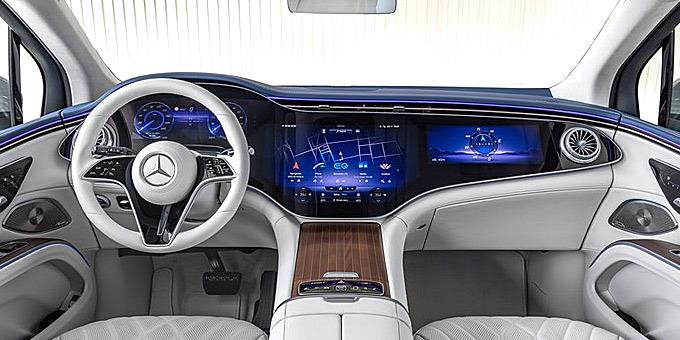 Το αποκορύφωμα του εσωτερικού είναι η υπεροθόνη MBUX (ειδικός εξοπλισμός). Αυτή η μεγάλη, κυρτή μονάδα οθόνης εκτείνεται σχεδόν από την αριστερή κολόνα Α έως την δεξιά κολόνα Α. Τρεις οθόνες βρίσκονται πίσω από ένα κοινό γυαλί καλύμματος και συγχωνεύονται οπτικά. Η οθόνη OLED 12,3 ιντσών για τον συνοδηγό του δίνει τη δική του περιοχή ελέγχου. Στην Ευρώπη και σε έναν αυξανόμενο αριθμό χωρών, ο επιβάτης στο μπροστινό κάθισμα μπορεί επίσης να παρακολουθεί δυναμικό περιεχόμενο ενώ το όχημα βρίσκεται σε κίνηση. Αυτό συμβαίνει επειδή το Mercedes-EQ μπορεί να βασίζεται σε μια έξυπνη λογική μπλοκαρίσματος που βασίζεται στην κάμερα: Εάν η κάμερα εντοπίσει ότι ο οδηγός κοιτάζει την οθόνη του συνοδηγού, το σύστημα μειώνει αυτόματα το δυναμικό περιεχόμενο.