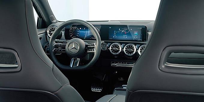 Η πολυτέλεια αντανακλάται και στο εσωτερικό της νέας A-Class. Το απόλυτο highlight είναι η τυπική ανεξάρτητη οθόνη διπλής οθόνης με μια οθόνη 7 ιντσών και τη μεγαλύτερη οθόνη 10,25 ιντσών να κατέχουν το επίκεντρο. Προαιρετικά παρέχονται δύο οθόνες 10,25 ιντσών που φαίνονται να επιπλέουν με την εμφάνιση ευρείας οθόνης. Η εσωτερική αρχιτεκτονική, η οποία είναι μοναδική σε αυτή την κατηγορία, δημιουργεί μια πολύ ιδιαίτερη ατμόσφαιρα φωτισμού που ίσως θυμίζει τον φωτισμό ενός φουτουριστικού κτιρίου τη νύχτα. Οι τρεις στρογγυλοί αεραγωγοί με εμφάνιση στροβίλου, χαρακτηριστικοί της Mercedes-Benz, αποτελούν φόρο τιμής στον κόσμο της αεροπορίας. Το αναθεωρημένο τιμόνι, από δέρμα νάπα στάνταρ, είναι συμπαγές και ταιριάζει με τον χαρακτήρα υψηλής τεχνολογίας της επανασχεδιασμένης κεντρικής κονσόλας.