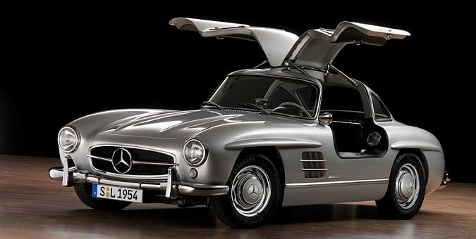 Mercedes Benz 300SL Gullwing Γνωστή και ως «Ο Γλάρος» λόγω της ιδιομορφίας των πορτών της οι οποίες ανοίγουν προς τα πάνω θυμίζοντας το πέταγμα του θαλασσινού πτηνού, η Mercedes Benz 300SL Gullwing υπήρξε το πρώτο αυτοκίνητο με injection αντί για το κλασσικό καρμπιρατέρ. Η Mercedes είχε κατασκευάσει μόλις 50 300SL προ-παραγωγής, και όλες ήταν χειροποίητες. Το ορίτζιναλ χρώμα της ήταν λευκό, ενώ το εσωτερικό της ήταν επενδυμένο με κόκκινο δέρμα με γκρι ταχύτητες και τιμόνι το οποίο για να μπει ο οδηγός «σπάει» προς τα κάτω και επαναφέρεται στη θέση του.