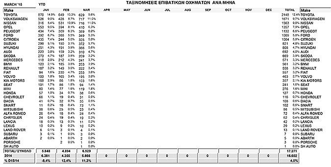 Κατά το τρίμηνο Ιανουαρίου-Μαρτίου 2015, οι ταξινομήσεις καινούργιων επιβατικών ήταν ελαφρώς αυξημένες ως προς το αντίστοιχο διάστημα του 2014. Στα καινούργια φορτηγά παρατηρείται σημαντική αύξηση από τις αρχές του έτους, ως προς την ίδια περίοδο πέρυσι, εξαιτίας, μεταξύ άλλων, και εκτελέσεων διαγωνισμών.