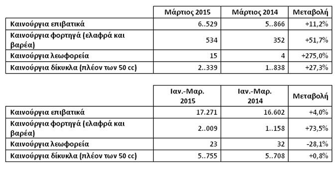 Στα καινούργια λεωφορεία διαπιστώνεται σημαντική αύξηση κατά το Μάρτιο 2015, ως προς τον ίδιο μήνα πέρυσι κυρίως εξαιτίας ανανέωσης εταιρικού στόλου αυτοκινήτων. Τέλος, στα καινούργια δίκυκλα (πλέον των 50 cc) οι ταξινομήσεις το μήνα Μάρτιο 2015 υπήρξαν αυξημένες κατά +27,3% ως προς το μήνα Μάρτιο 2014.