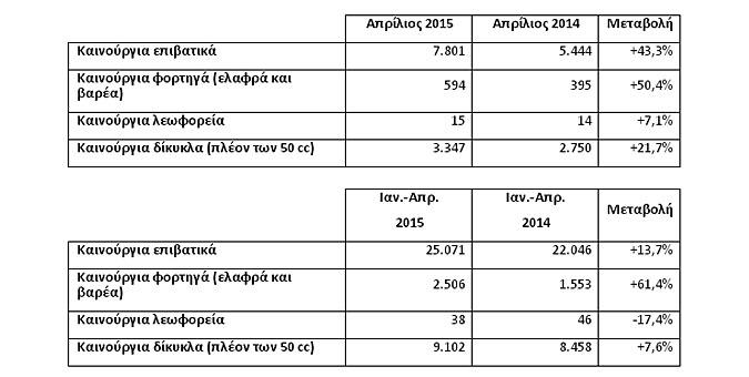 Αυξημένες κατά 43,3% ήταν οι ταξινομήσεις καινούργιων επιβατικών αυτοκινήτων το μήνα Απρίλιο, σε σχέση με τον περασμένο Απρίλιο, σύμφωνα με τα στοιχεία της ΕΛΣΤΑΤ. Συνολικά στο τετράμηνο Ιανουαρίου-Απριλίου 2015, οι ταξινομήσεις καινούργιων επιβατικών είναι αυξημένες κατά 13,7% ως προς το αντίστοιχο διάστημα του 2014. Η σημαντική πρόοδος στις ταξινομήσεις καινούργιων επιβατικών κατά το μήνα Απρίλιο αιτιάζεται στις αυξημένες πωλήσεις αυτοκινήτων προς ενοικίαση. Σημειώνεται επίσης ότι ακόμη και με την πρόοδο των εταιρικών πωλήσεων του περασμένου μηνός, η αγορά αυτοκινήτου κατά το πρώτο τετράμηνο βρίσκεται -74,8% χαμηλότερα από το μέσο όρο δεκαετίας. Στα καινούργια φορτηγά παρατηρείται σημαντική αύξηση από τις αρχές του έτους, ως προς την ίδια περίοδο πέρυσι, εξαιτίας, μεταξύ άλλων, και εκτελέσεων διαγωνισμών. Τέλος, στα καινούργια δίκυκλα (πλέον των 50 κ.εκ οι ταξινομήσεις από τις αρχές του έτους ήταν αυξημένες κατά +7,6% ως προς το αντίστοιχο διάστημα το 2014.