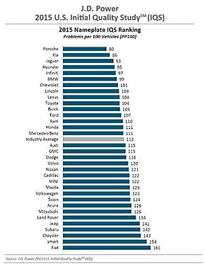 Εδώ και 29 χρόνια, η ετήσια μελέτη IQS της JD Power αναλύει τις απαντήσεις των ιδιοκτητών των οχημάτων σε 26 κατηγορίες, οι οποίοι αξιολογούν την οδηγική εμπειρία, τον κινητήρα και τις επιδόσεις των οχημάτων τους καθώς και ένα ευρύ φάσμα προβλημάτων που αφορούν στην ποιότητα μέσα στις πρώτες 90 ημέρες από την ιδιοκτησία.