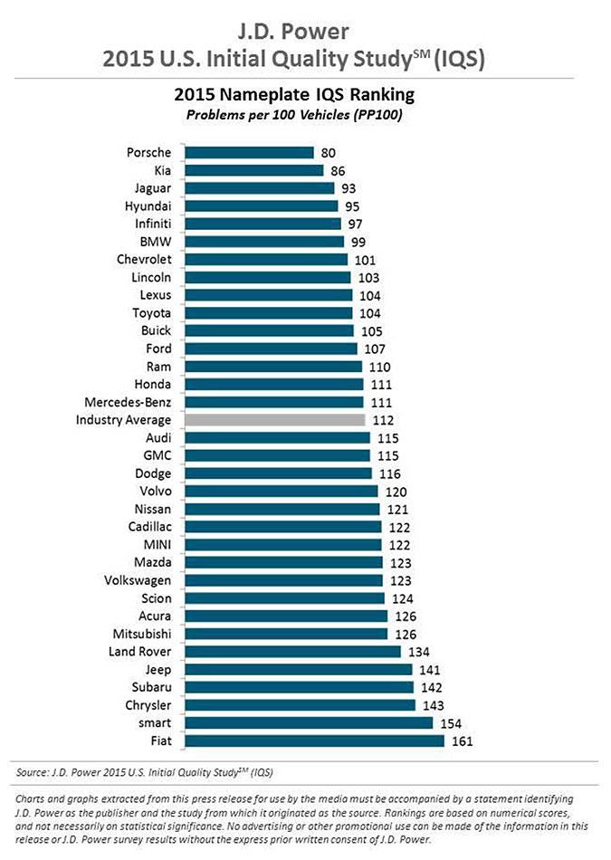 Συνολικά ο κλάδος σύμφωνα με τη μελέτη, βιώνει μια βελτίωση της τάξεως του 3% από έτος σε έτος στην αρχική ποιότητα, φθάνοντας κατά μέσο όρο στα 112 PP100 σε σύγκριση με 116 PP100 το 2014. Οι Κορεατικές μάρκες φθάνουν συλλογικά τα 90 PP100 κατά μέσο όρο, μια βελτίωση των 11 PP100 από το 2014. Οι Ευρωπαϊκές μάρκες, με 113 PP100, ξεπερνούν τις Αμερικάνικες και τις Ιαπωνικές μάρκες, που φθάνουν στα 114 PP100. "Αυτή είναι μια σαφής στροφή στο πεδίο της ποιότητας" δήλωσε ο κ. Renee Stephens, Αντιπρόεδρος της JD Power στο κλάδο αυτοκινήτου της Αμερικής. «Για πολύ καιρό, οι ιαπωνικές μάρκες έχουν θεωρηθεί από πολλούς ως ο χρυσός κανόνας στην ποιότητα του οχήματος. Ενώ οι ιαπωνικές αυτοκινητοβιομηχανίες συνεχίζουν να κάνουν βελτιώσεις, βλέπουμε άλλες μάρκες, κυρίως κορεατικές μάρκες, που πραγματικά επιταχύνουν τον ρυθμό βελτίωσης. Κορυφαίες εταιρείες όχι μόνο επιταχύνουν το ρυθμό των βελτιώσεων τους σε υπάρχοντα μοντέλα, αλλά εργάζονται πυρετωδώς από το λανσάρισμα των οχημάτων ακόμη για υψηλότερη ποιότητα και πιο διαισθητική σχεδίαση». Για τρίτη συνεχόμενη χρονιά, τα συστήματα ψυχαγωγίας και συνδεσιμότητας είναι τα πιο επιρρεπή σε προβλήματα στον τομέα της αυτοκινητοβιομηχανίας. Τα συστήματα αναγνώρισης φωνής συχνά αναφέρονται ως προβληματικά, καθώς η πλειοψηφία των μοντέλων που περιλαμβάνονται στη μελέτη που διαθέτουν συστήματα αναγνώρισης φωνής λαμβάνουν 10 ή περισσότερα PP100 που σχετίζονται με αυτό το χαρακτηριστικό. Ο αριθμός των ιδιοκτητών που επιθυμούν την αναγνώριση φωνής στο νέο όχημά τους έχει αυξηθεί στο 67% το 2015 από 57% το 2013.