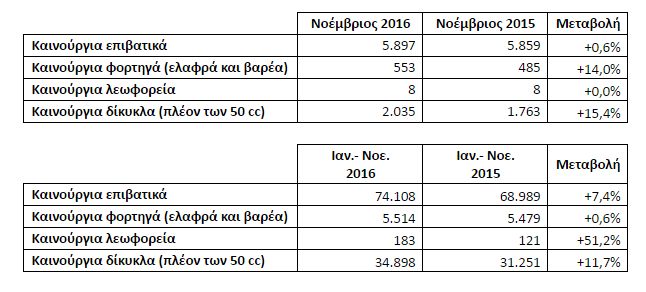 Συνολικά, στο ενδεκάμηνο Ιανουαρίου-Νοεμβρίου 2016 οι ταξινομήσεις καινούργιων επιβατικών είναι αυξημένες κατά +7,4% ως προς το αντίστοιχο διάστημα του 2015. Ακόμη και με αυτήν την πρόοδο η αγορά αυτοκινήτου βρίσκεται -71,2% χαμηλότερα ως προς το μέσο όρο της δεκαετίας 2000-2009. Στα καινούργια φορτηγά παρατηρείται ελάχιστη αύξηση από τις αρχές του έτους (+0,6%), ως προς την ίδια περίοδο πέρυσι, ενώ στα καινούργια δίκυκλα (πλέον των 50 cc) οι ταξινομήσεις την περίοδο Ιαν.-Νοε. σημειώνουν αύξηση (+11,7%) ως προς το αντίστοιχο διάστημα του 2015.