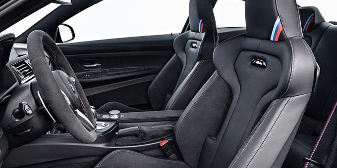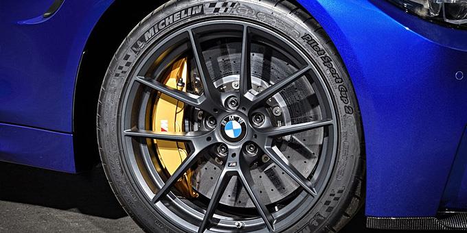 Για άνετη οδήγηση στην αγωνιστική πίστα ιδανικές είναι οι ελαφρές ζάντες αλουμινίου (εμπρός: 9 J x 19, πίσω: 10 J x 20) σχεδιασμένες αποκλειστικά για τη M4 CS σε συνδυασμό με ελαστικά Michelin Pilot Sport Cup 2 στάνταρ (εμπρός: 265/35 R 19, πίσω: 285/30 R 20). Αυτά τα ημι-σλικ ελαστικά ενιαίου, που έχουν έγκριση τύπου και για χρήση στο δρόμο, προσφέρουν ασυναγώνιστη πρόσφυση και εξαιρετική πλευρική ευστάθεια στις υψηλές ταχύτητες στην πίστα, καθώς και βέλτιστη πρόσφυση στην έξοδο από φουρκέτες. Η M4 CS διατίθεται επίσης κατόπιν παραγγελίας με ελαστικά δρόμου Michelin Sport χωρίς επιπλέον κόστος. Το εσωτερικό της νέας BMW M4 CS στοχεύει στη δημιουργία ενός σπορ περιβάλλοντος. Ξεκινώντας από τα ελαφριά, σπορ καθίσματα M με επένδυση δέρματος/Alcantara, η δυναμική αίσθηση επεκτείνεται μέχρι τις επενδύσεις των θυρών από συμπιεσμένες φυσικές ίνες που φέρουν ιμάντες-χειρολαβές. Το καπό – με το χαρακτηριστικό αεραγωγό πίσω από την κεντρική εισαγωγή – και η οροφή κατασκευάζονται από ελαφρύ, εξαιρετικά άκαμπτο και high-tech πλαστικό υλικό ενισχυμένο με ανθρακονήματα (CFRP).