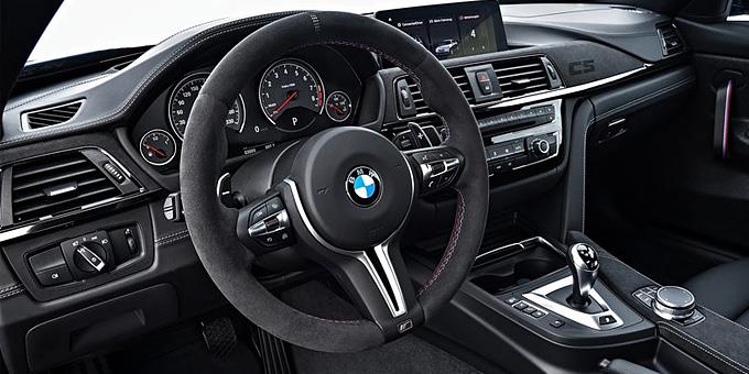 Η ευρεία χρήση δέρματος και Alcantara διαμορφώνει μία ασυναγώνιστη σπορ ατμόσφαιρα. Κανείς οδηγός της M4 CS δεν θα χρειαστεί να απαρνηθεί ανέσεις και απολαύσεις. Ο βασικός εξοπλισμός του αυτοκινήτου περιλαμβάνει αυτόματο έλεγχο κλιματισμού, μία έκδοση του συστήματος BMW HiFi Professional προσαρμοσμένη στις ακουστικές απαιτήσεις της M4 CS και σύστημα Πλοήγησης Navigation Professional. Με έμφαση στις ανάγλυφες φόρμες, οι σχεδιαστές της BMW M GmbH έδωσαν στη νέα M4 CS μία εμφάνιση που αντανακλά τις σπορ προθέσεις του αυτοκινήτου. Στοιχείο ταυτότητας του εντυπωσιακού εμπρός τμήματος μαζί τους προηγμένους δίδυμους προβολείς LED με τα κομμένα άκρα είναι η εμπρός ποδιά με μεγάλους αεραγωγούς τριών τμημάτων. Αυτοί τροφοδοτούν με άφθονο αέρα ψύξης τόσο τον κινητήρα υψηλών επιδόσεων όσο και τα συνθετικά φρένα Μ που είναι ανθεκτικά στη σκληρή χρήση, με τετραπίστονες δαγκάνες μπροστά και διπίστονες πίσω. Το νέο, ειδικό εμπρός σπλίτερ, είναι κατασκευασμένο από ανθρακονήματα αποκλειστικά για την ειδική έκδοση M4 CS. Για βελτιωμένη αεροδυναμική απόδοση, αυτό συνεργάζεται με το πίσω διαχύτη - γνωστό από τη BMW M4 GTS - και την επίσης νέα αεροτομή τύπου Gurney από ανθρακονήματα στο πορτμπαγκάζ για μείωση της αεροδυναμικής άνωσης. Καινοτόμα πίσω φώτα με τεχνολογία OLED (Organic Light Emitting Diode) που λανσαρίστηκαν από τη BMW M GmbH αποκλειστικά για τις M4 CS και M4 GTS, ανοίγουν νέους ορίζοντες, ενώ το εμπρός σπλίτερ, η αεροτομή Gurney και ο πίσω διαχύτης, μαζί με το μακρύ καπό από CFRP, την κομψή coupe γραμμή οροφής, τους κομψούς εξωτερικούς καθρέπτες M και τους μυώδεις θόλους των τροχών, συνθέτουν μία άκρως δυναμική σιλουέτα για τη BMW M4 CS ακόμα και όταν είναι ακίνητη.