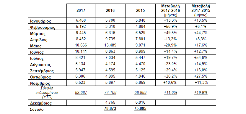 Συνολικά, στο ενδεκάμηνο Ιανουαρίου-Νοεμβρίου 2017 οι ταξινομήσεις καινούργιων επιβατικών είναι αυξημένες κατά +11,6% ως προς το αντίστοιχο διάστημα του 2016.