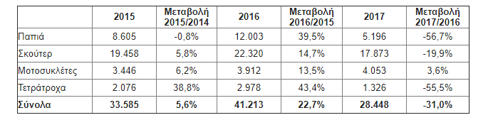 Μείωση των ταξινομήσεων κατά 31% παρουσίασε η ελληνική αγορά δικύκλου (άνω των 50 κυβικών εκατοστών) το 2017. Σημειώνεται ότι αυτή η πτώση δεν ανταποκρίνεται στην πραγματική πορεία των λιανικών πωλήσεων του 2017, οι οποίες ο Κλάδος Δικύκλων του ΣΕΑΑ εκτιμά ότι μειώθηκαν κατά 12-13% περίπου.