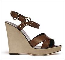 Στροφή στα γυναικεία. Εδώ η επιλογή γίνεται πραγματικά αδύνατη. Αμέτρητα δερμάτινα σανδάλια, υπέροχες γόβες με χοντρή σόλα και φυσικά… πλατφόρμες. Κάπου εκεί σταματάμε και κάνουμε focus στις Nymona της φωτογραφίας. Πανύψηλες για να κάνουν το πόδι να φαίνεται χιλιομετρικό, λουριά με χρώμα σε σκούρο ζιρκόν και πάτος στο χρώμα της άμμου, δέρμα και στις δύο περιπτώσεις, από μοσχάρι και σουέντ, tribal διάθεση και τιμή… στα 390 ευρώ.